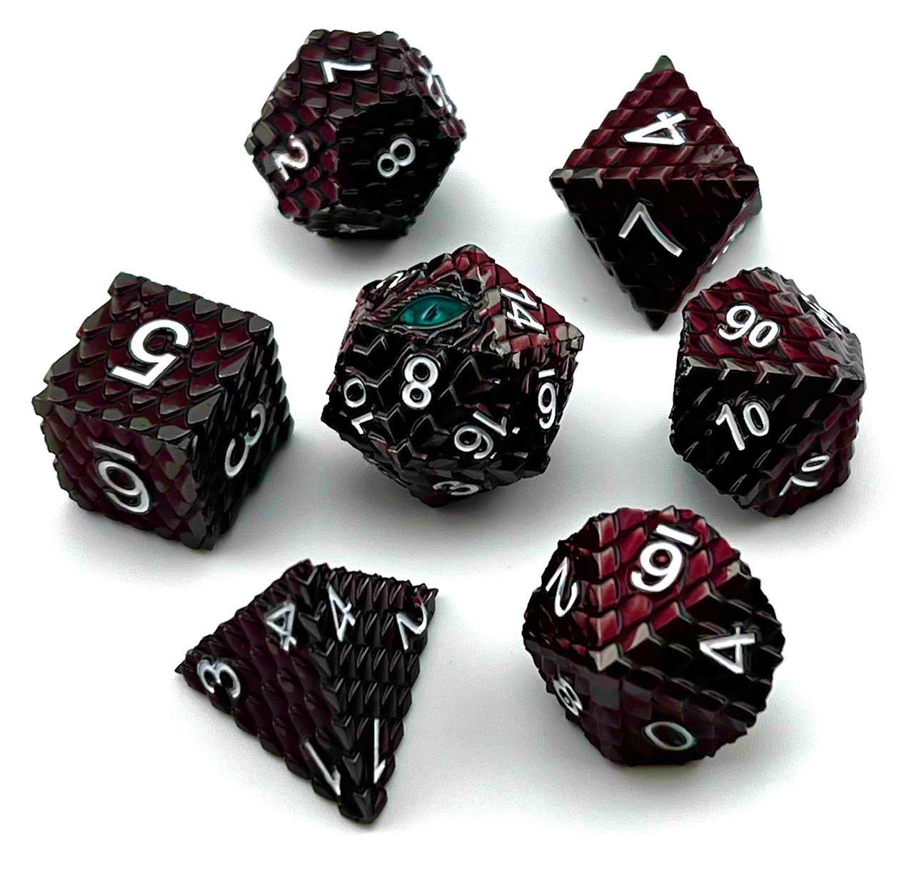 The Dragons have arrived! These highly textured Dragonscale dice are made of a durable zinc alloy. Roll a 20 on the d20, and you are stared at by the Dragon's eye! These beautifully crafted dice are ready for your next attack or defense!